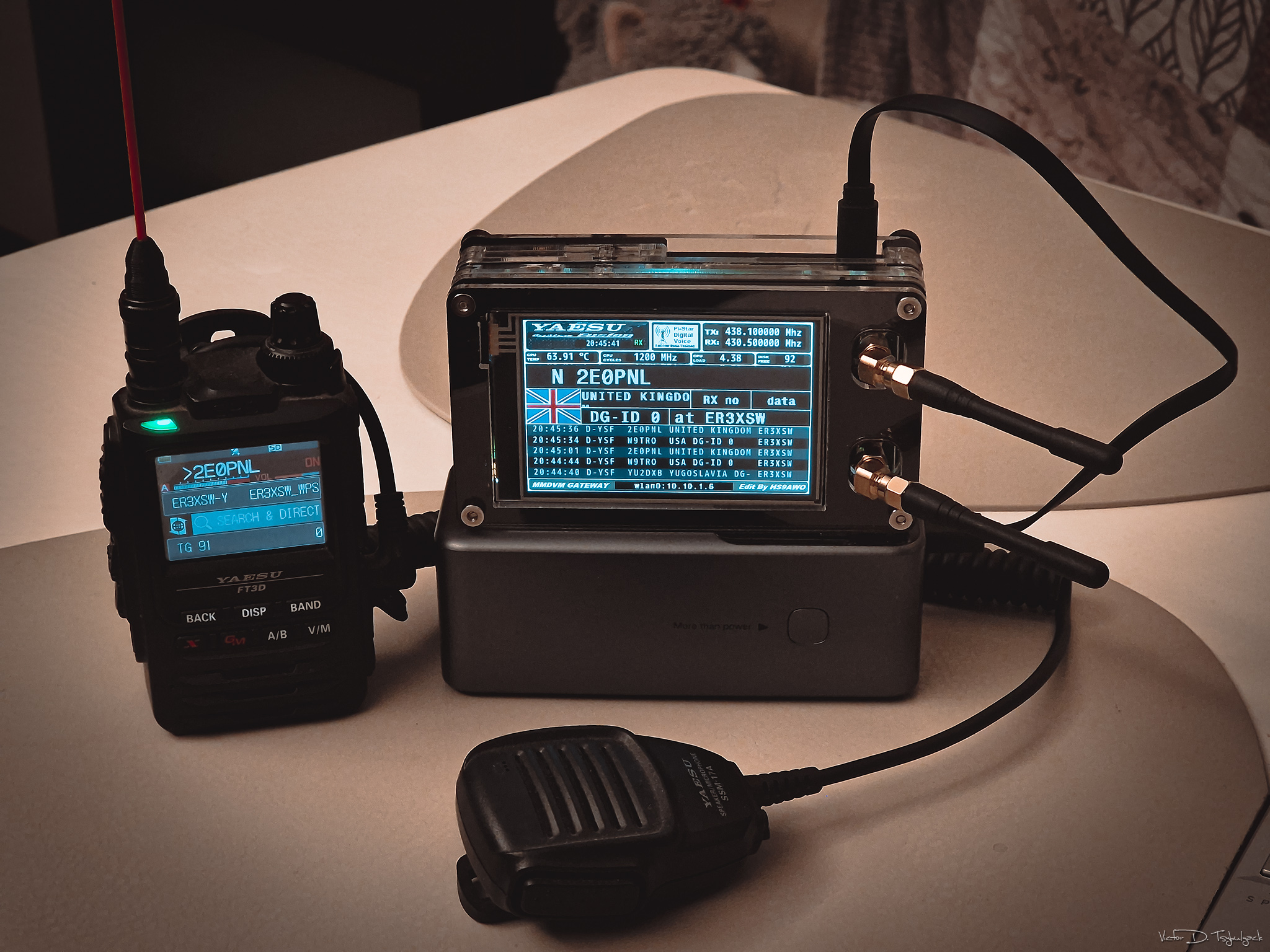В общем, собрал на кучу «малинку», дуплексный MMDVM радиомодуль, дисплейчик от Nextion на 3,5 дюйма и прошивку WPSD. Дисплейчик прошил лэйаутом от тайца HS9AWO. Всё засунул в очень клёво нарезанный лазером кейс от C4LABS.